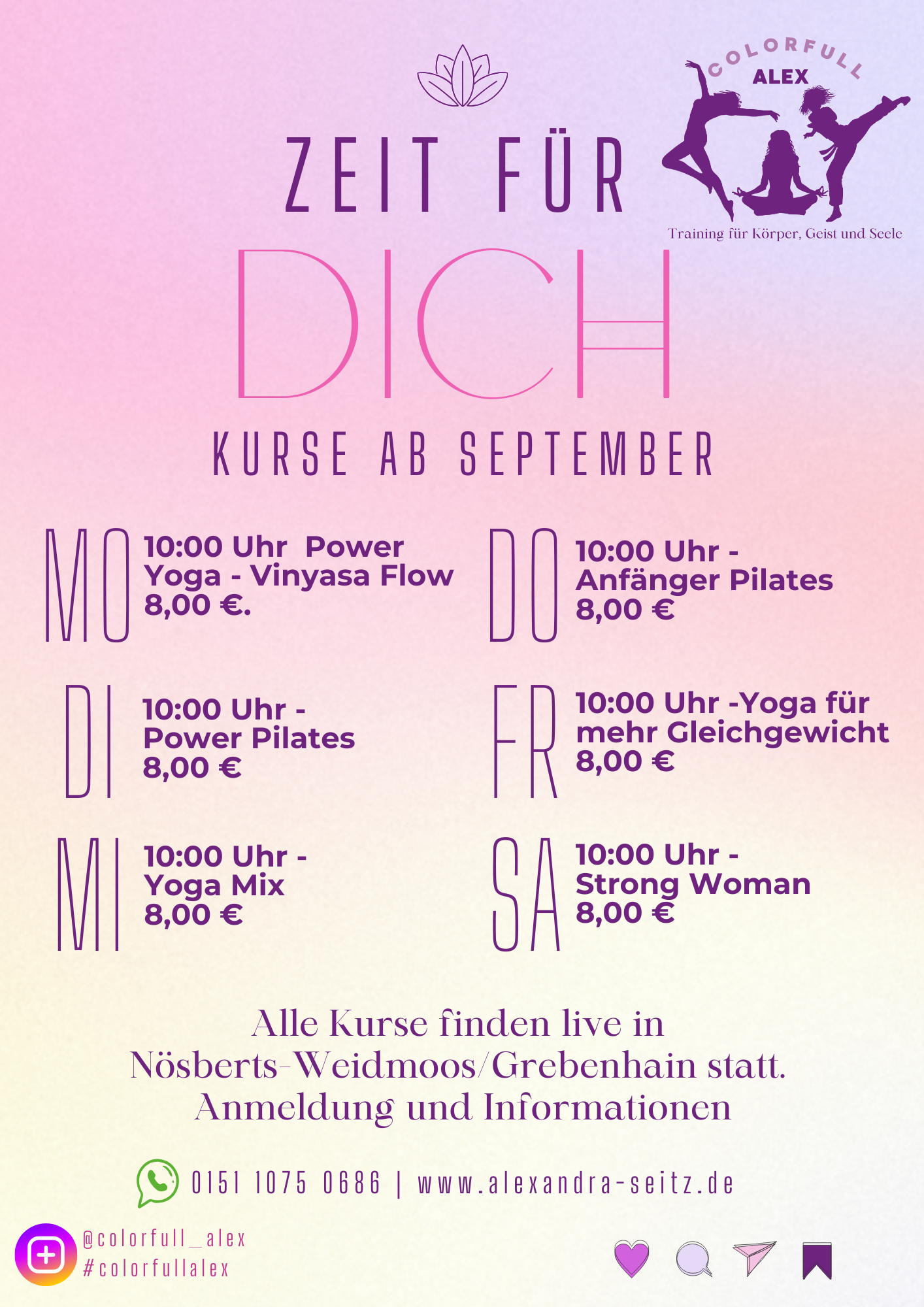 Egal, ob du deine innere Stärke durch Yoga und Pilates entfalten, dich bei einem meiner Fitnesskurse auspowern oder in beeindruckenden Stelzenauftritten abheben möchtest – ich begleite dich auf deinem Weg.
